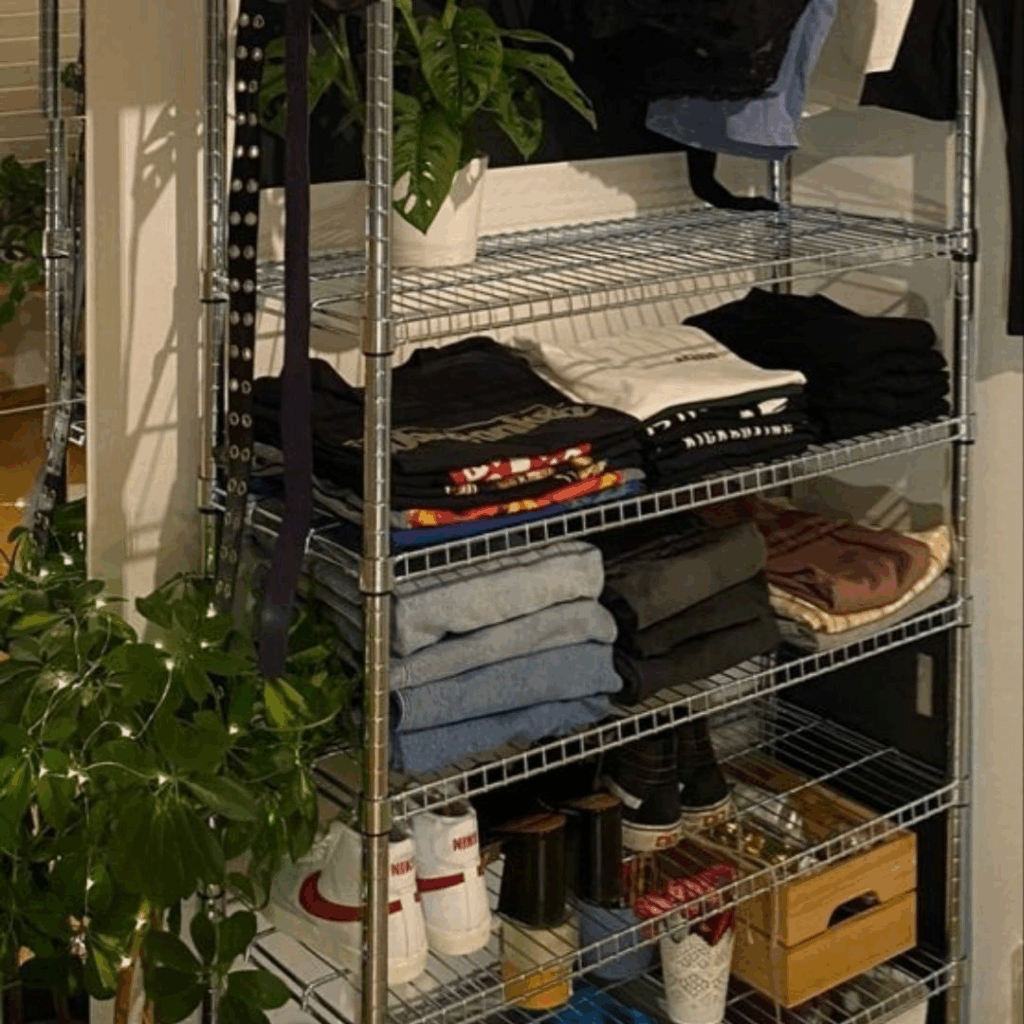 収納ラックは部屋をおしゃれにしつつ収納にも使える優れもの!一人暮らしをするとどうしても服を畳んだ後引き出しだといれるのがめんどくさい…けどこの収納ラックなら畳んでおくだけでスマートに大量の服を置くことができるよ!